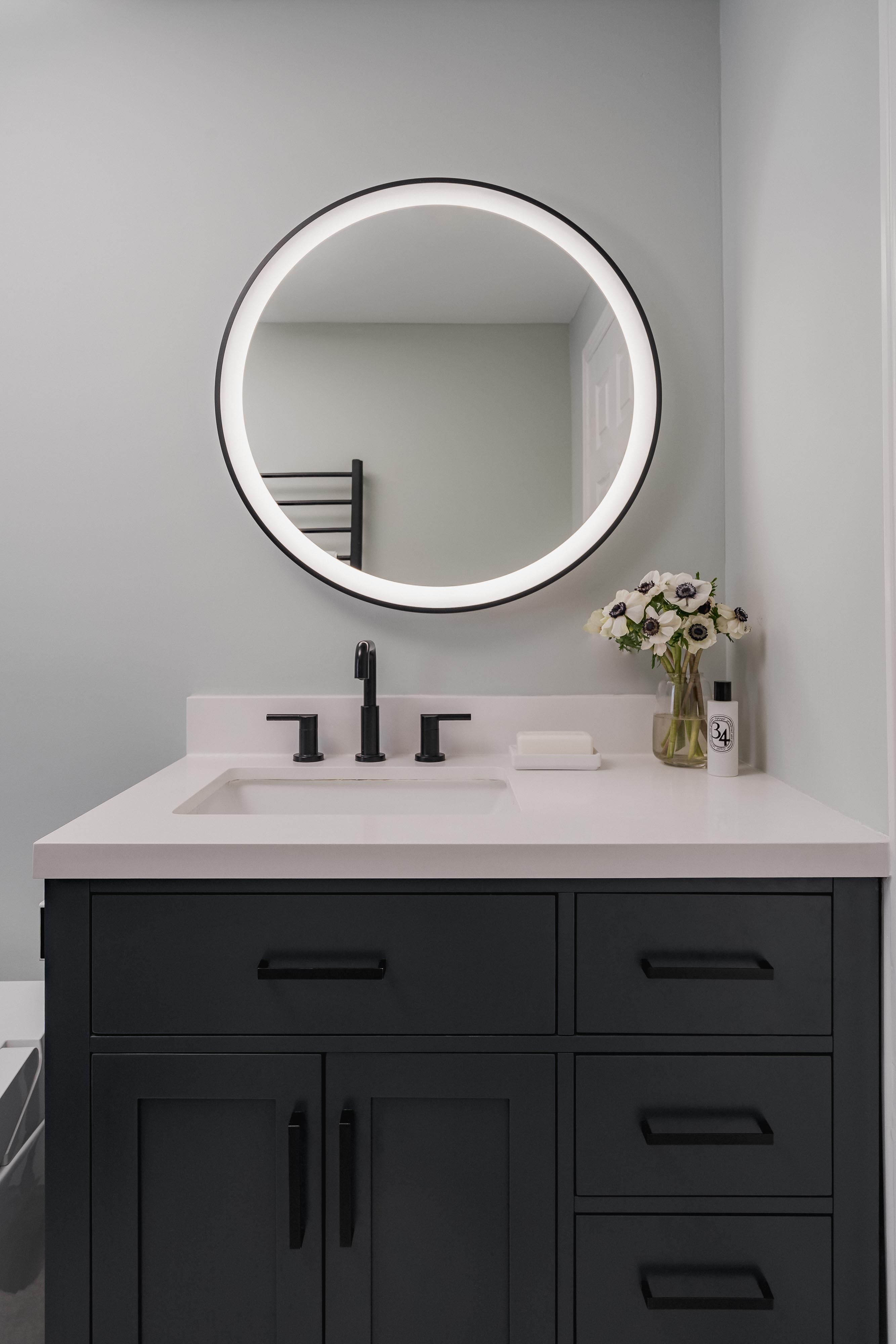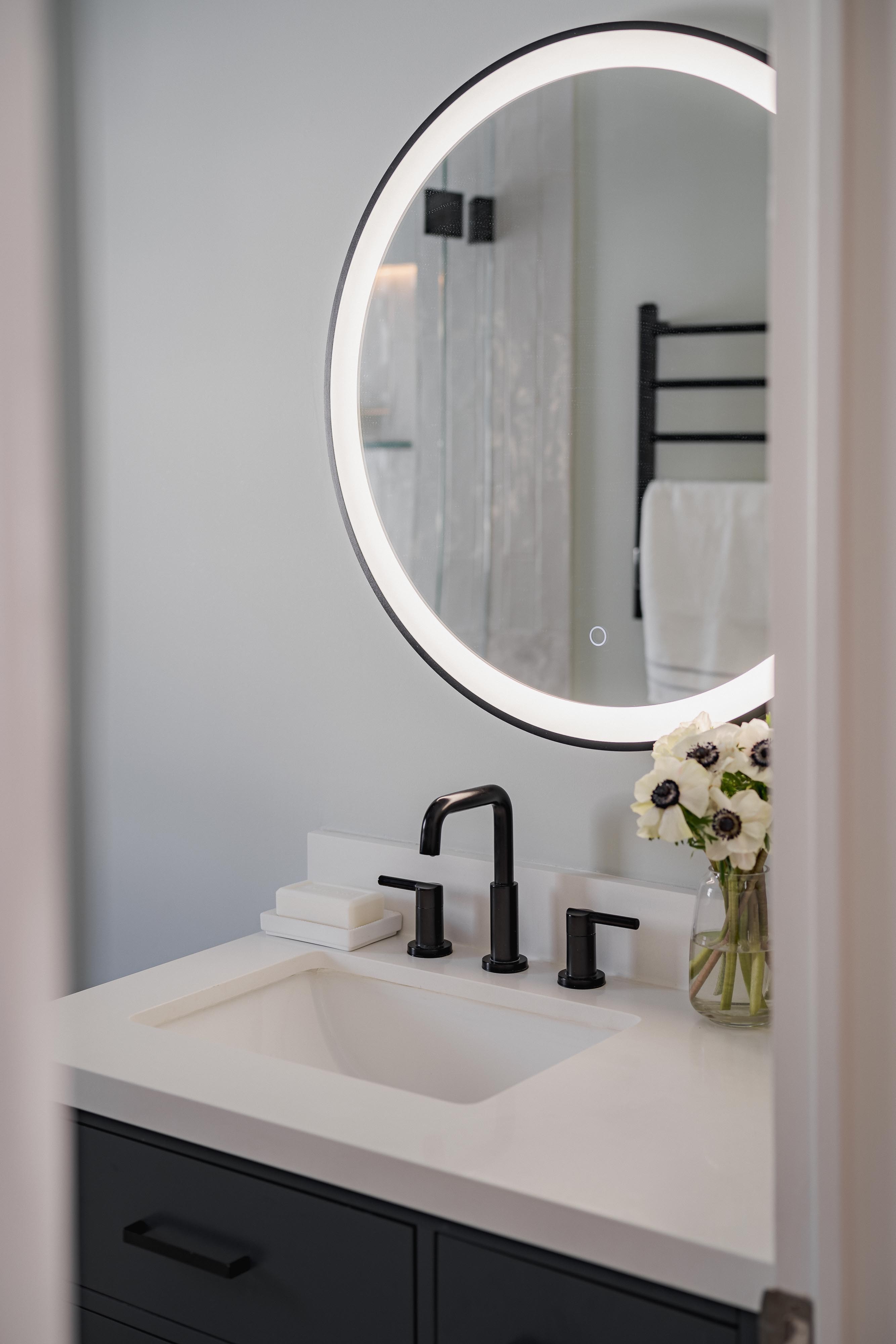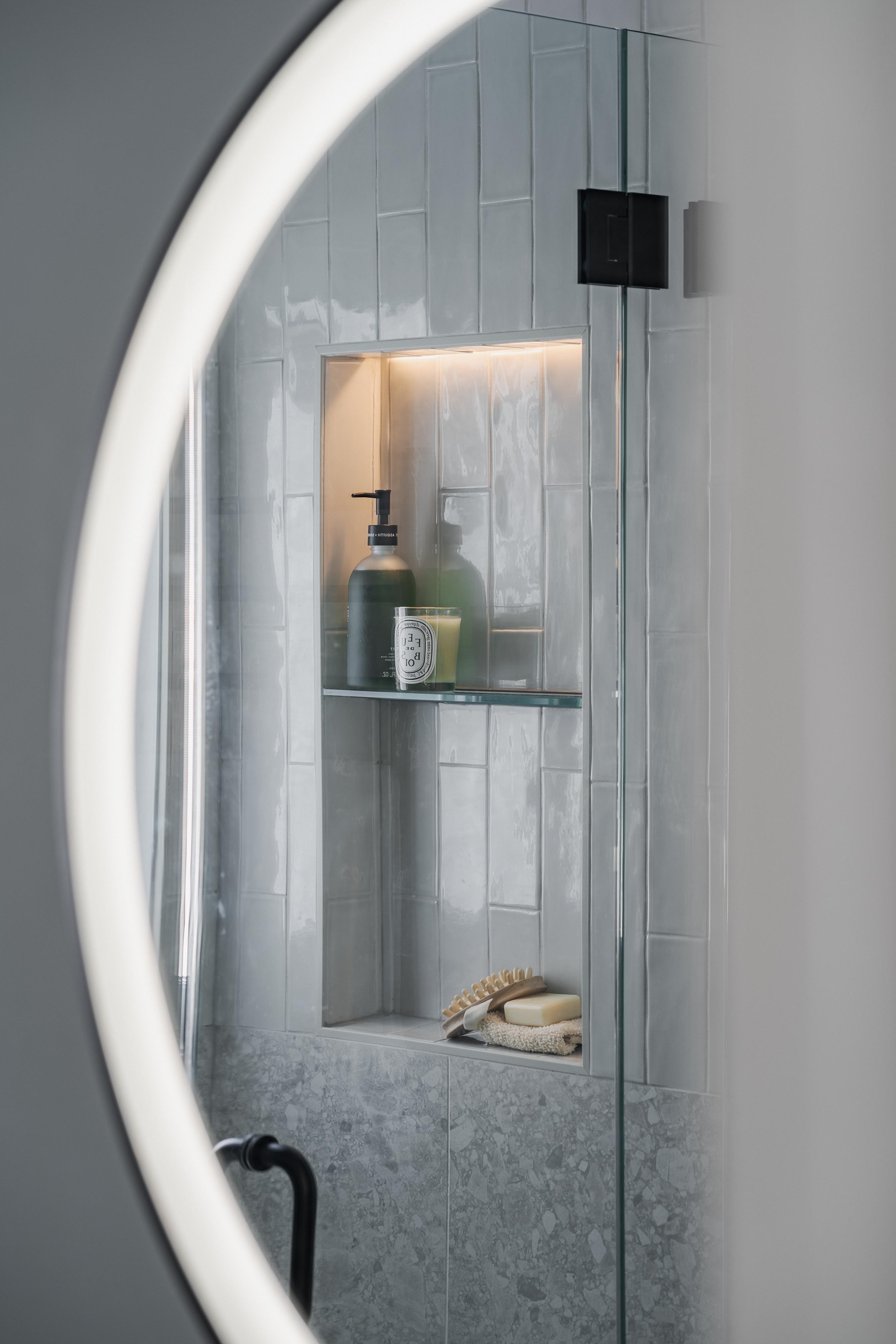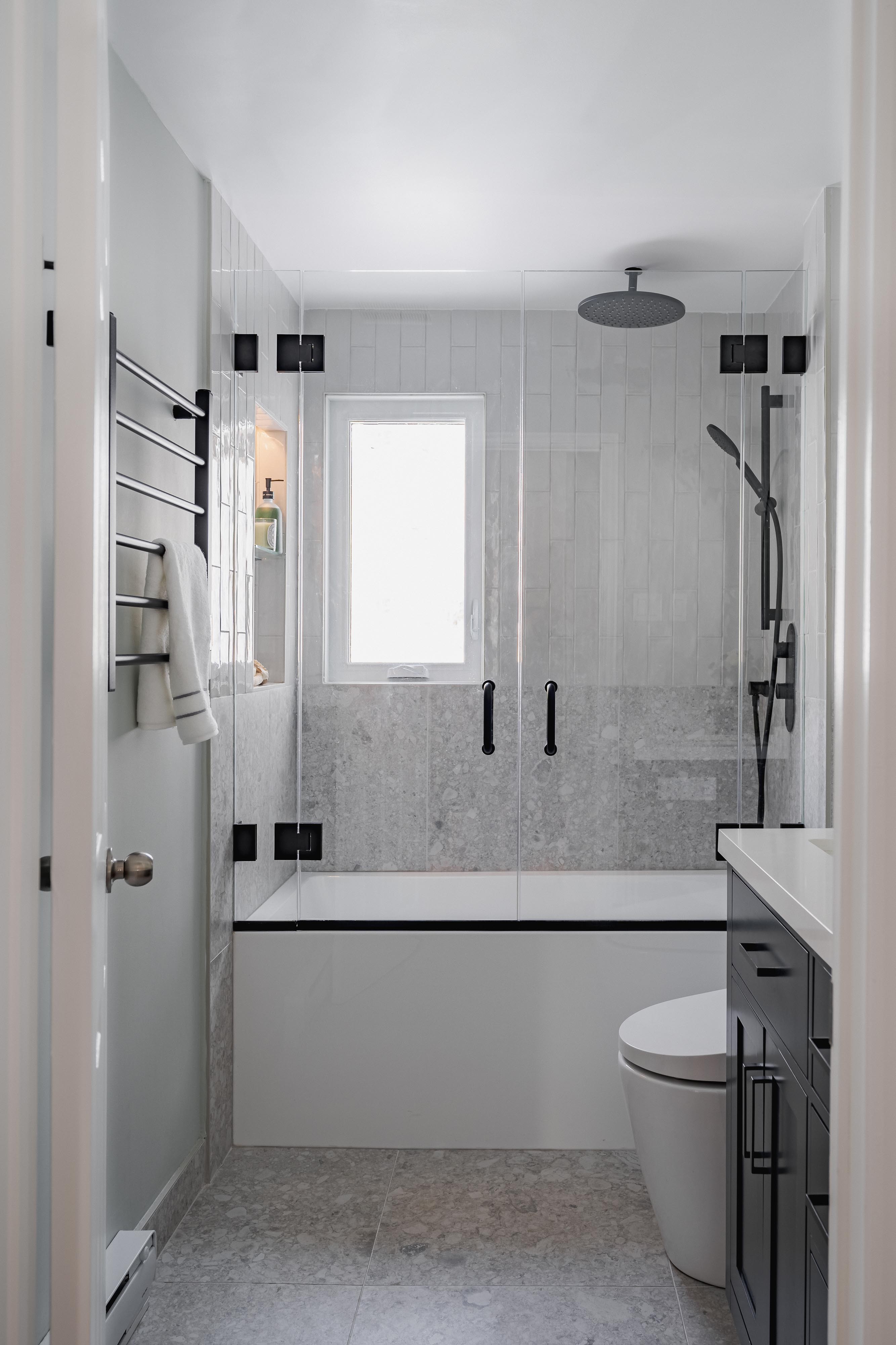 The small bathroom was thoughtfully designed to provide comfort, efficiency, and a refined aesthetic, making the client’s everyday routine more enjoyable and effortless!